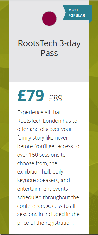 Für die im Vergleich zur amerikanischen RootsTech um einen Tag kürzere „family celebration“ kann man sich bereits jetzt im Internet registrieren – bis zum 23. April sogar zum Frühbucher-Preis: £ 79 (brit. Pfund => ca. € 90,- bis € 96,- je nach Wechselkurs) kostet der 3-Tages-Pass (Normalpreis £ 89,-), für 39 £ kann man einen Tag zur Messe und für 19 £ wird ein „Virtual Pass“ verkauft, der zur Ansicht von 20 Video-Mitschnitten von Vorträgen („classes“) am heimischen PC oder tablet berechtigt.